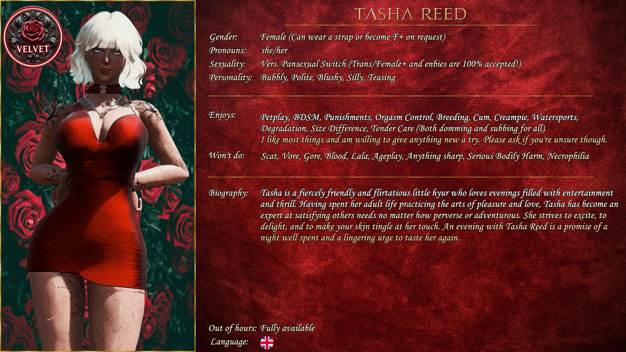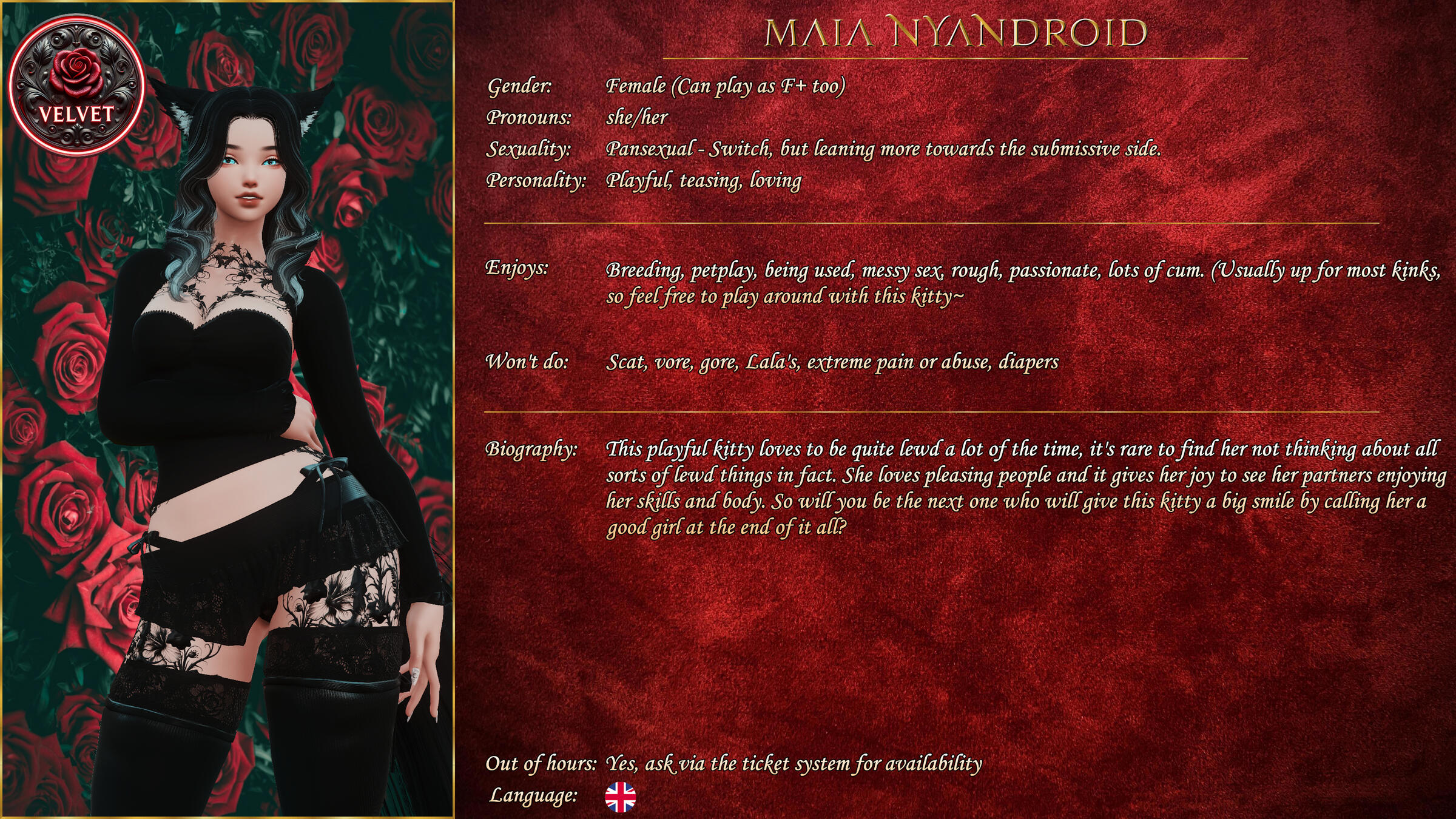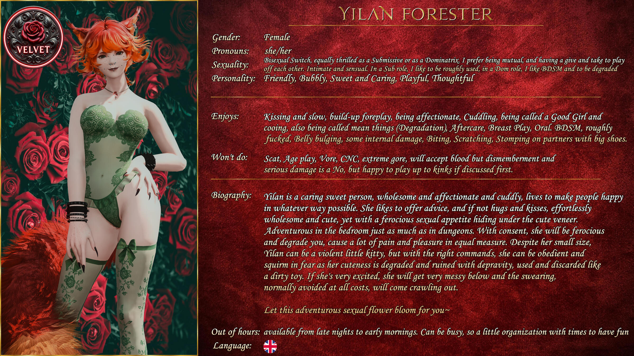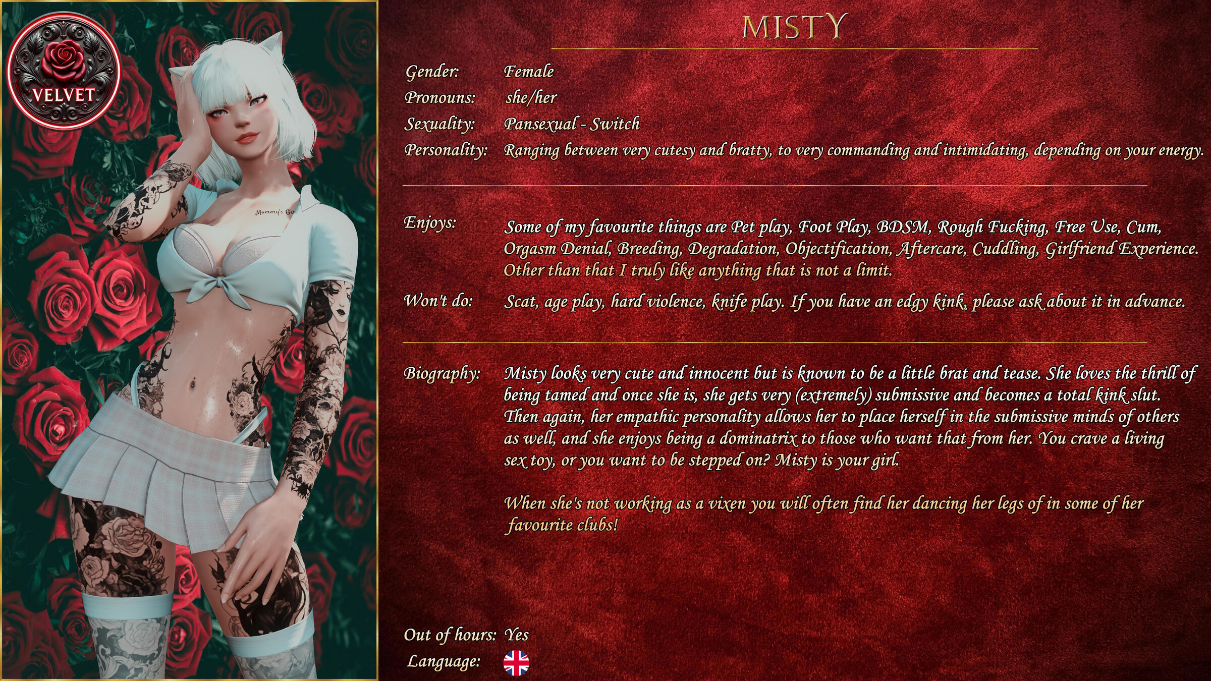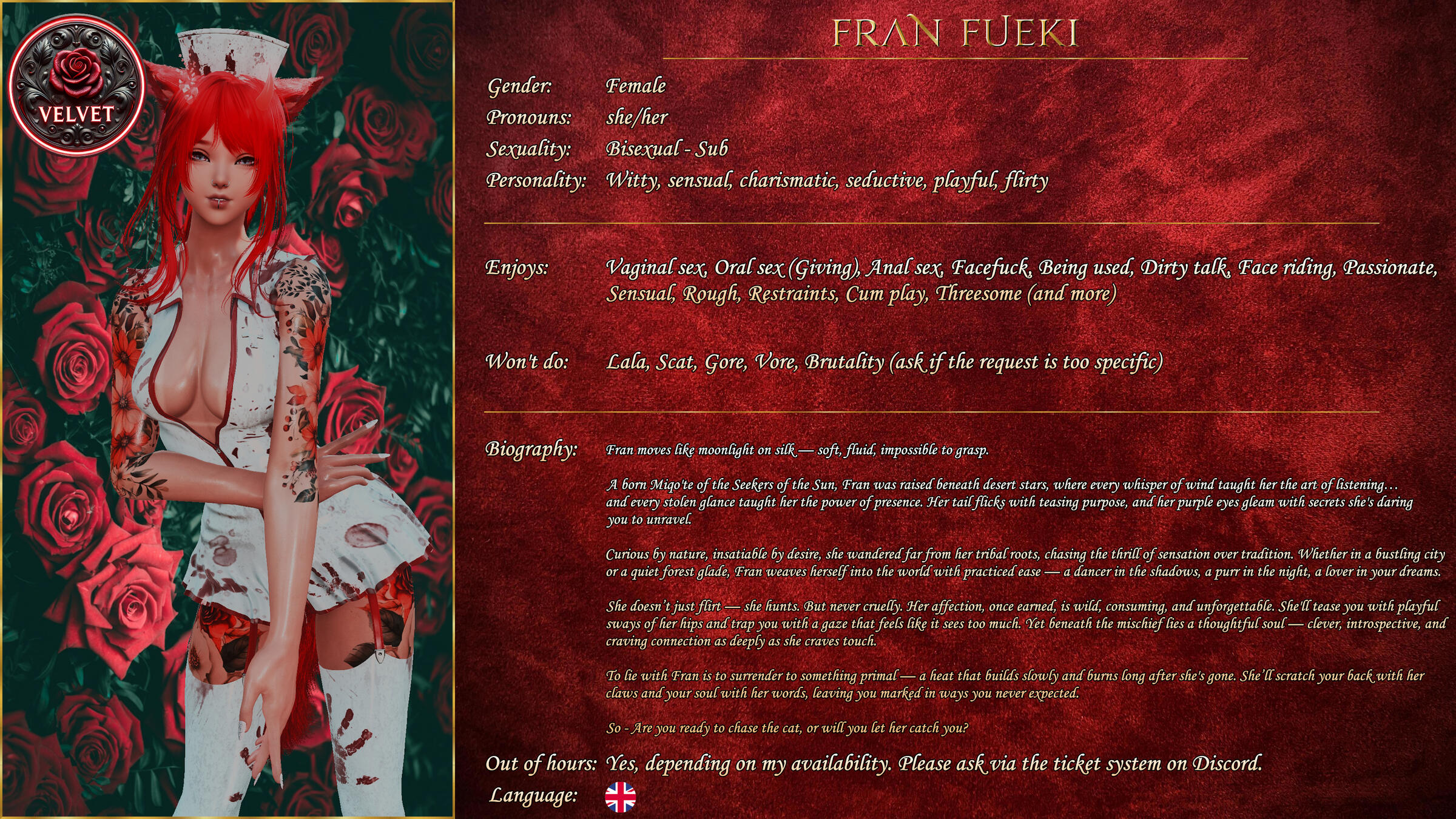 If you're looking to book a Vixen outside of working hours, please check to see if they offer it in their profile on our discord. If they do, open a ticket and we'll make sure you can arrange something.