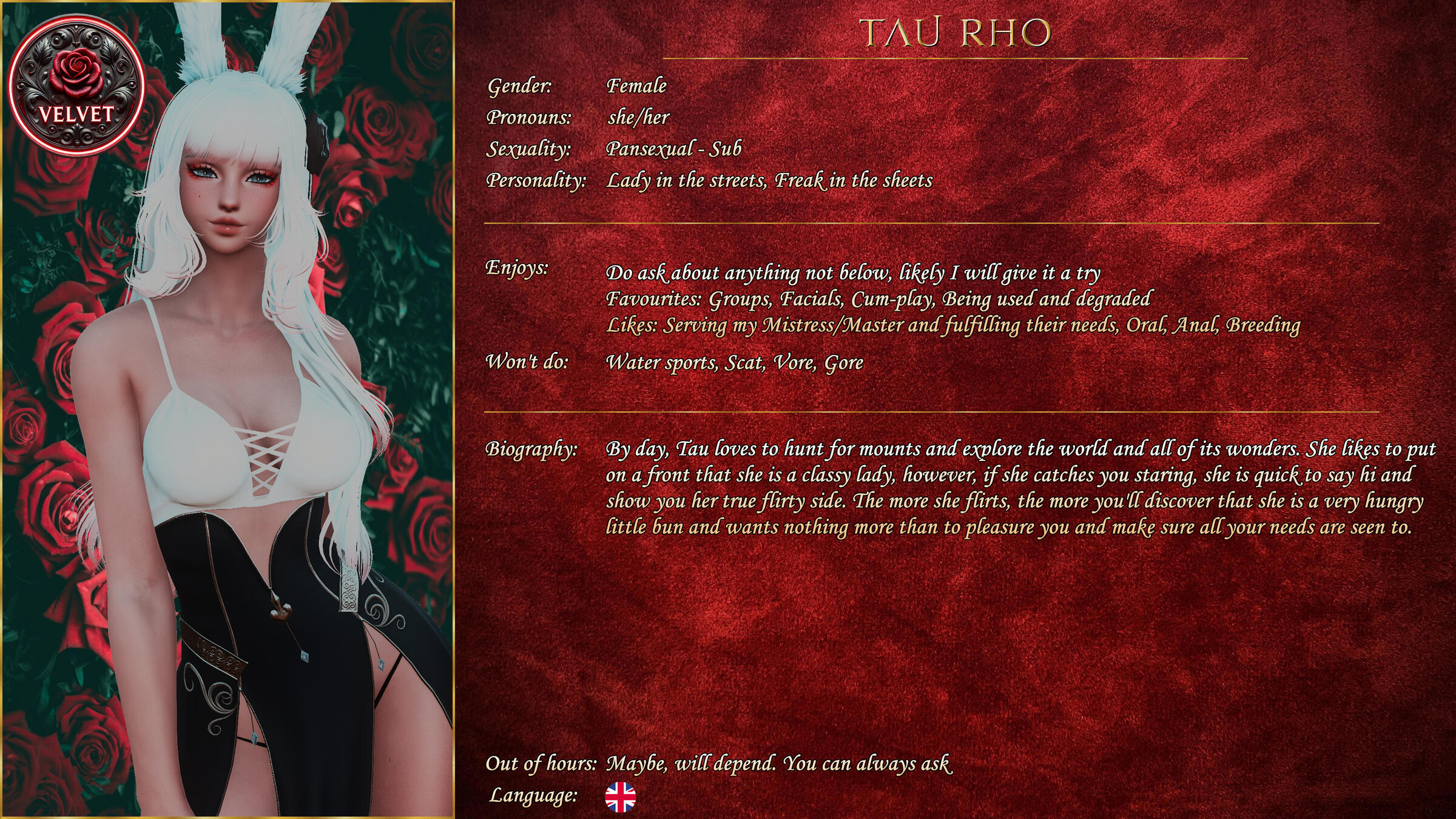 Be you adventurer or city elite, hero or villain, from Tural to Garlemald, here at Velvet we welcome you with open arms and tails. Looking for a quiet spot to discuss the latest political machination in Tuliyollal? Kick back with friends and listen to some music? Or retain one of our Vixens and taste of their exquisite delights? The choice is yours and Velvet has you covered.