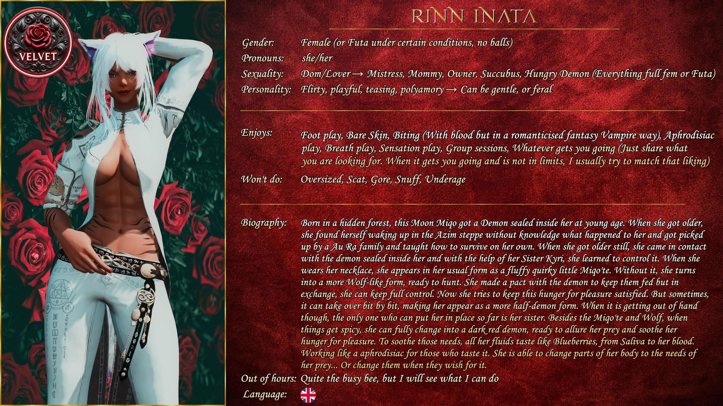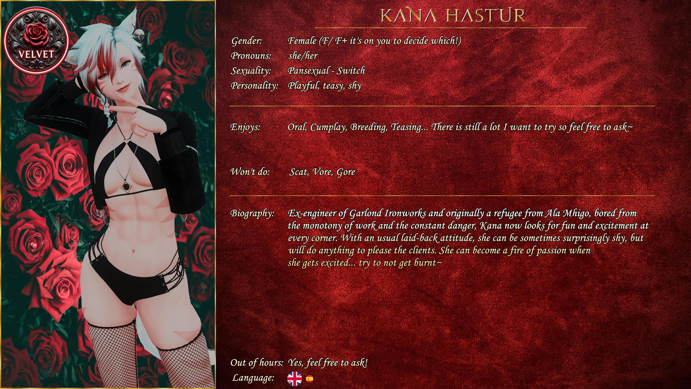 Velvet offers a discreet but friendly venue for those wanting to relax after a hard weeks adventuring. Offering a chill environment with superb bar staff, great company and the best poker dealer in Eorzea, Velvet has it all. All this is of course in addition to our selection of the most talented courtesans, or our Vixens, on the continent, who will be more than happy to sate your darkest desires with 100% confidentiality assured, in one of our custom designed private rooms.