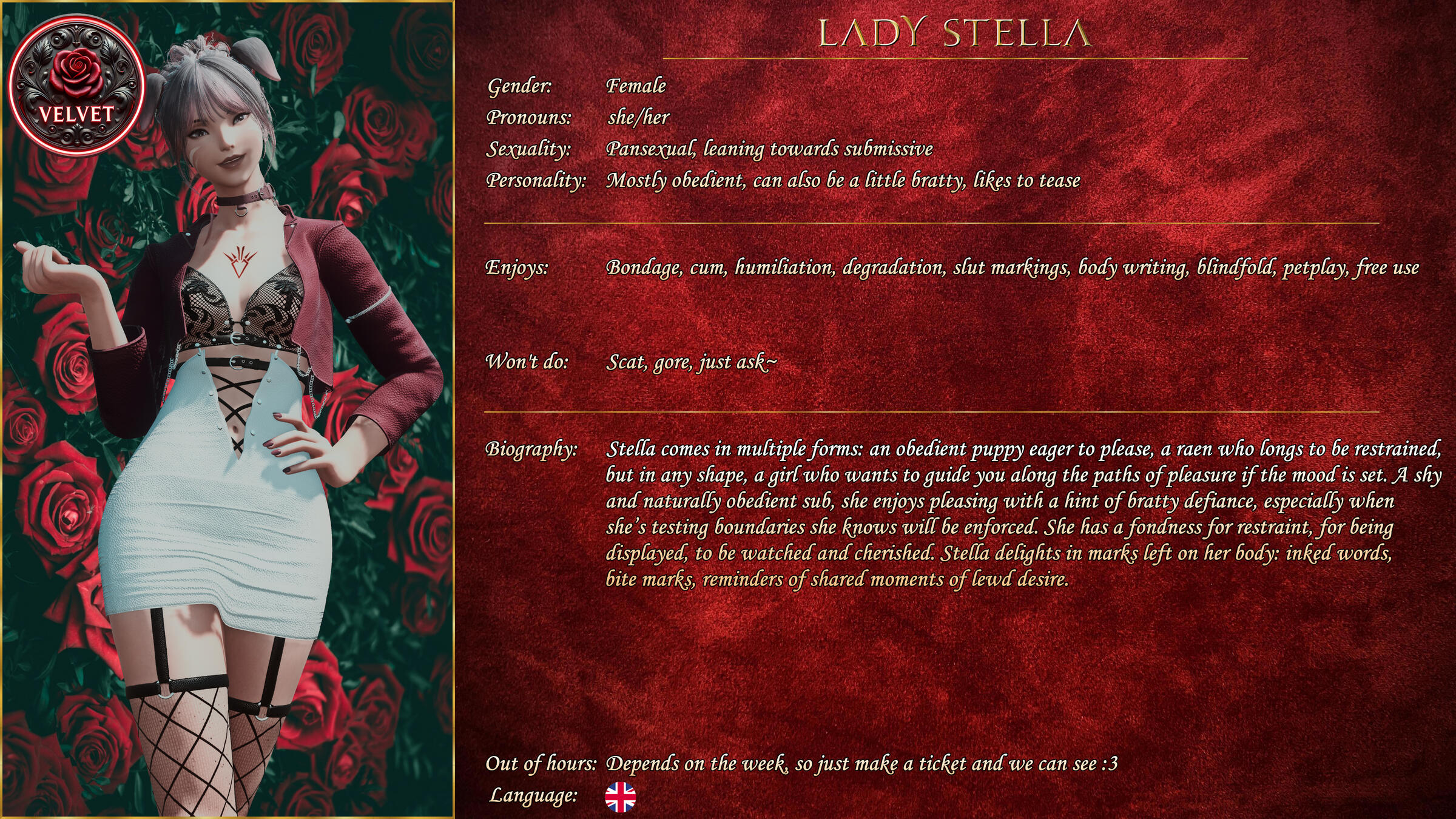 If you're looking to book a Vixen outside of working hours, please check to see if they offer it in their profile on our discord. If they do, open a ticket and we'll make sure you can arrange something.