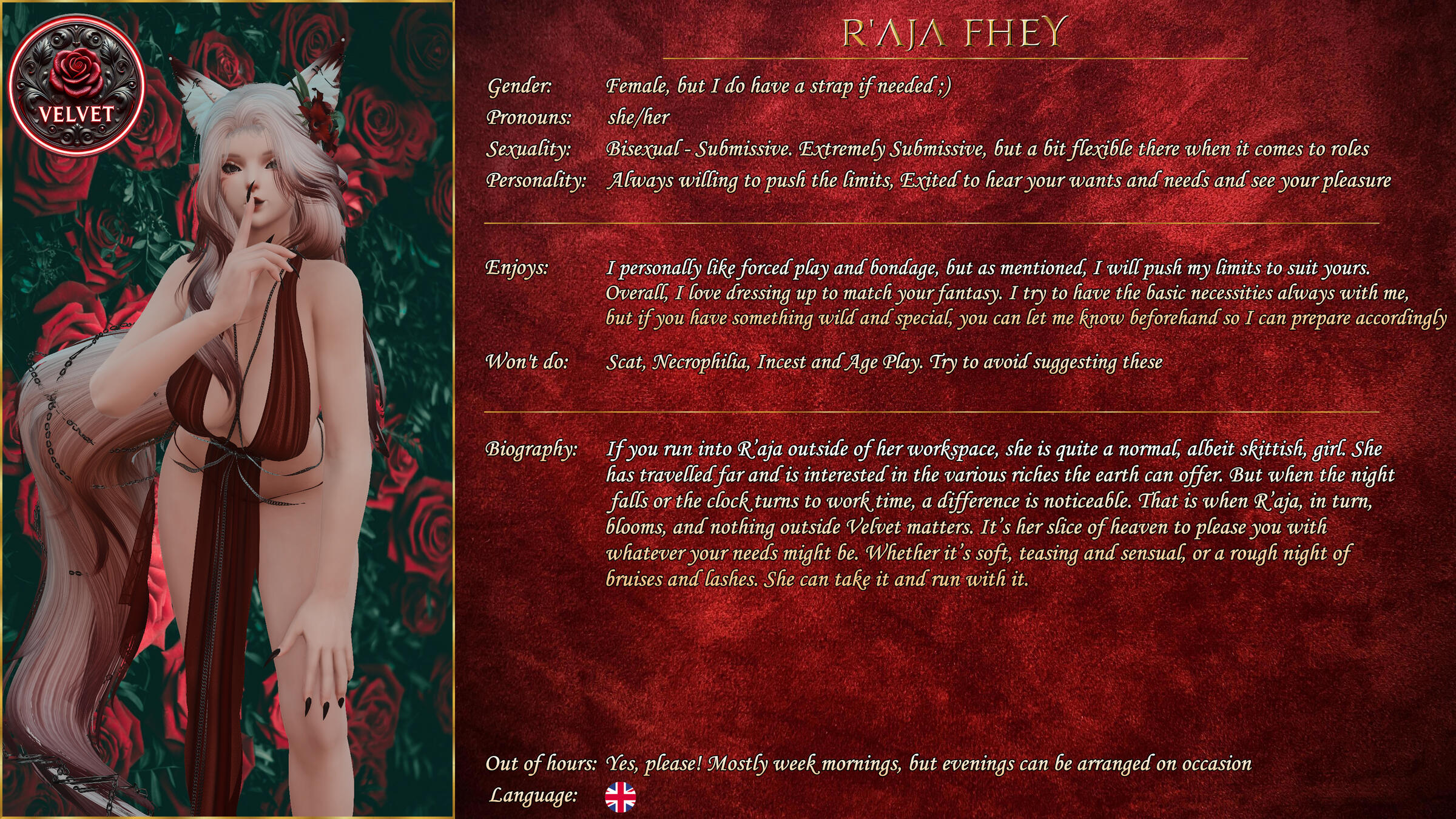So come, relax, have fun and ease your tired mind for a time. Our Vixens will take your worries and smooth them away with but a gentle, velvety touch… or the hard end of a riding crop depending on your wants, the client comes first at Velvet and we’re more than happy to oblige.